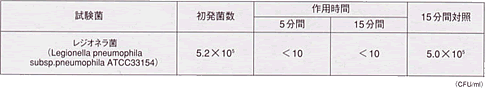 | ■レジオネラ菌 1)試験機関 (財)北里環境科学センター 2)殺菌効果報告 5分間及び15分間の作用で殺菌効果を認めた